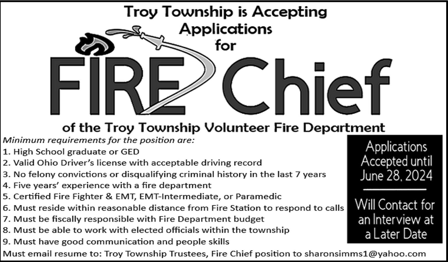 Troy Township: June 6, 7 p.m., Zoning Commission. All meetings are held at Troy Community Center, 13950 Main Market Road, unless noted.