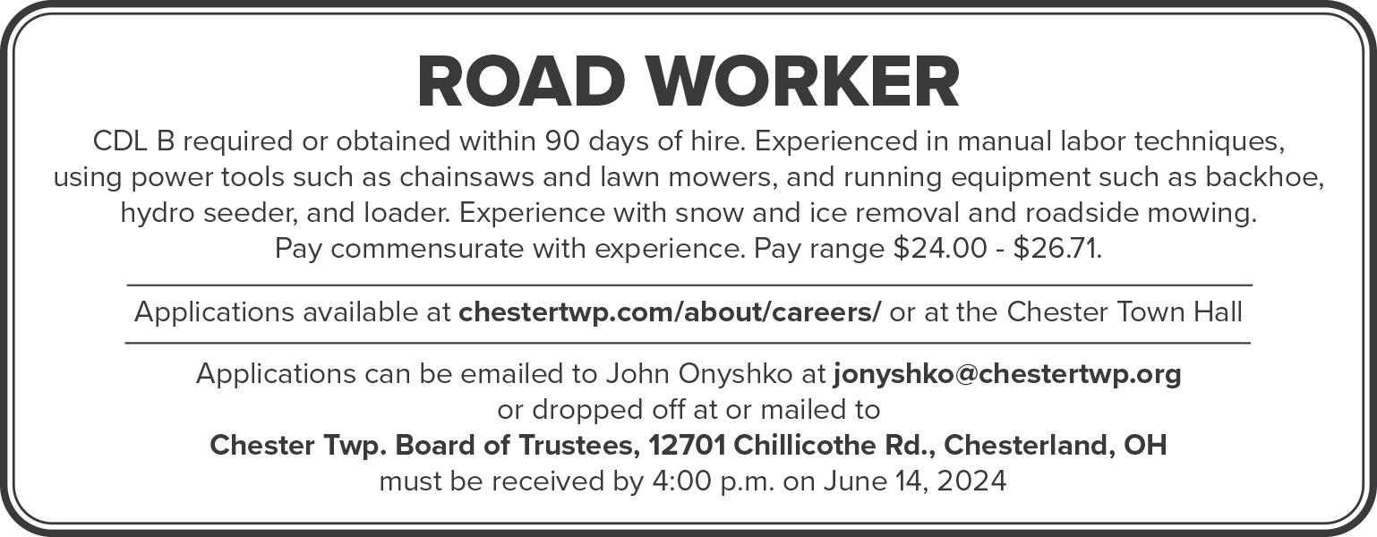 Chester Township: June 10, 7 p.m., Board of Zoning Appeals; June 13, 4:30 p.m., Board of Trustees. All meetings are held at the Township Hall, 12701 Chillicothe Road, unless otherwise noted.