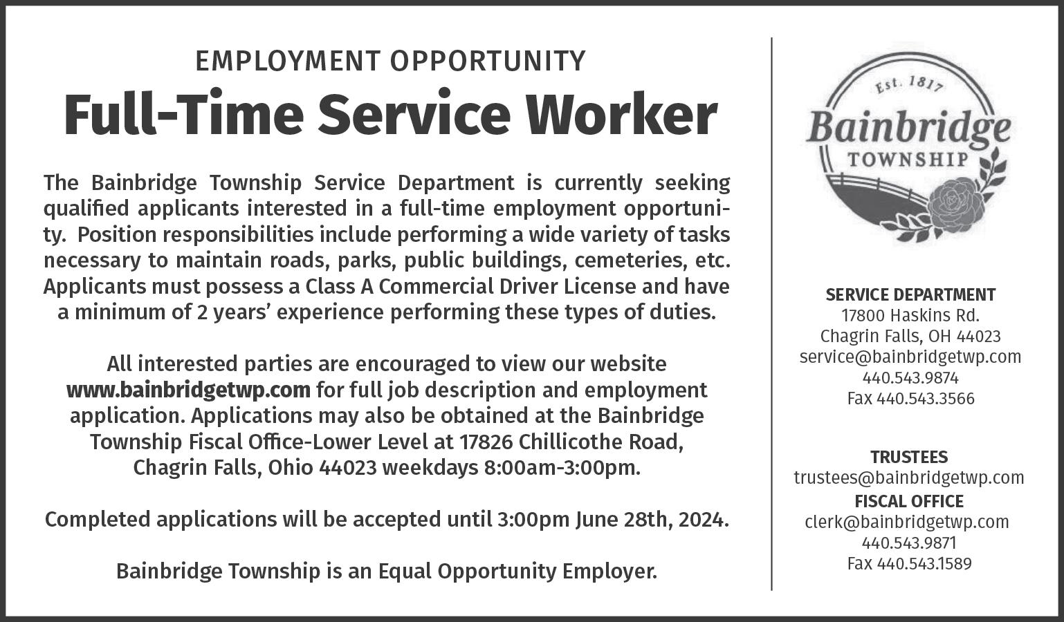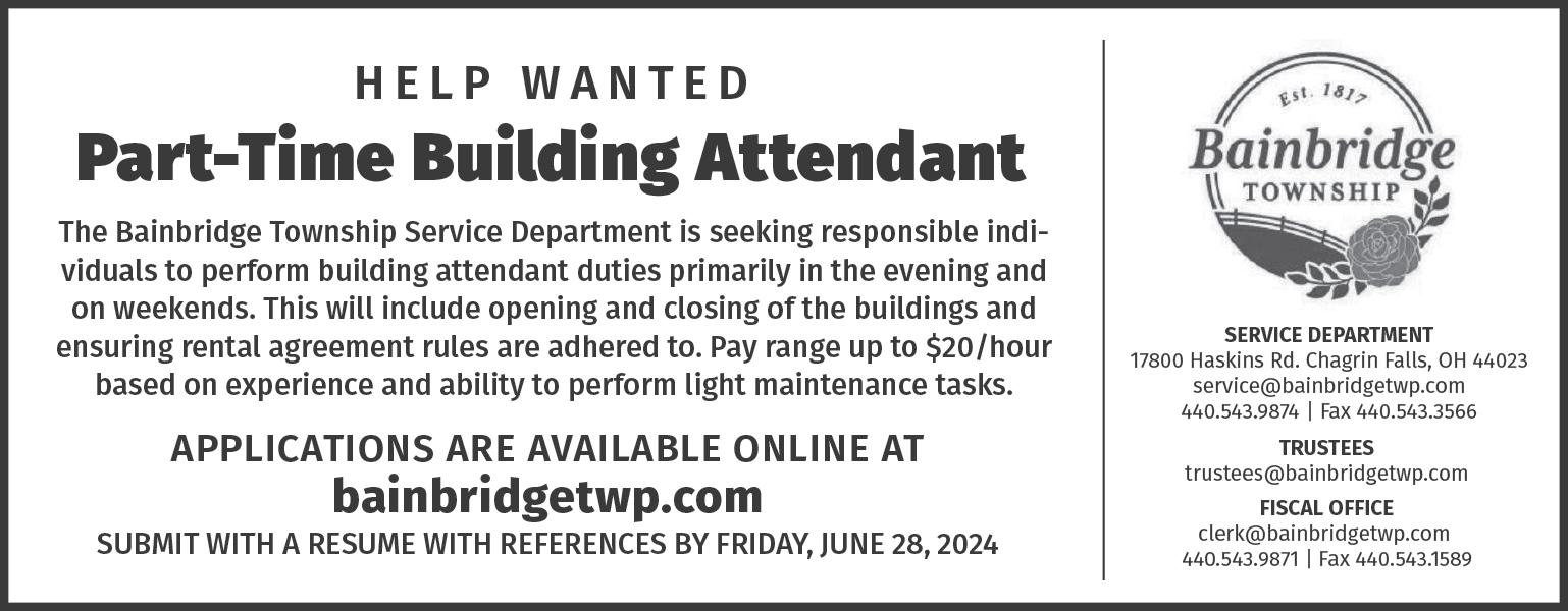 Bainbridge Township: June 10, 7 p.m., Board of Trustees. All meetings are held at Town Hall, 17826 Chillicothe Road, unless noted.