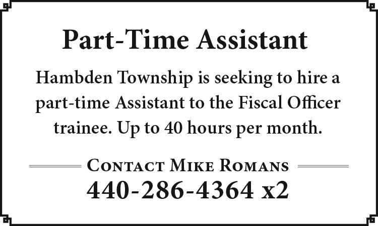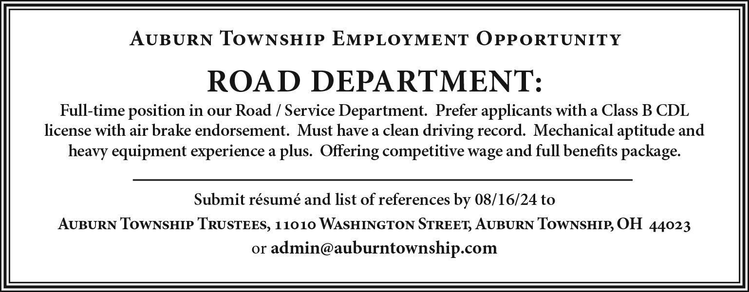 Claridon Township: July 22, 7 p.m., Board of Trustees. All trustees’ meetings are held at Administrative Building, 13932 Mayfield Road, unless otherwise noted. All Zoning Commission and Board of Zoning Appeals meetings are held at Town Hall, 13930 Mayfield Road.