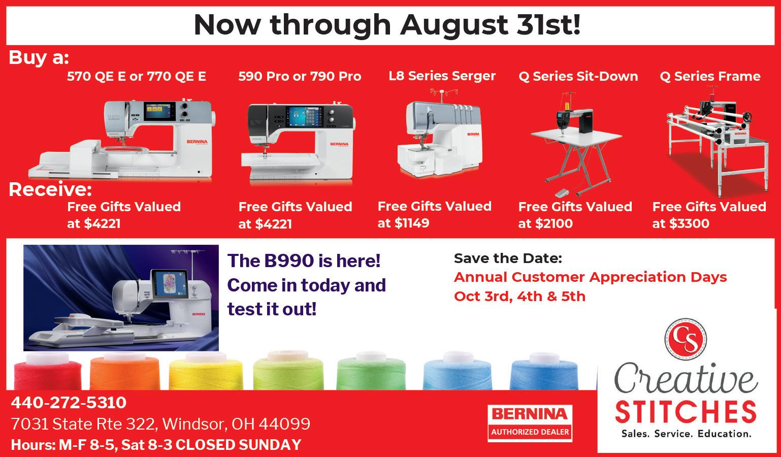 Janome Memory Craft 15000 Embroidery Machine, Koala Slimline Artisan Cabinet in Golden Teak w/chair, wine color. For more information call 440-533-5292.