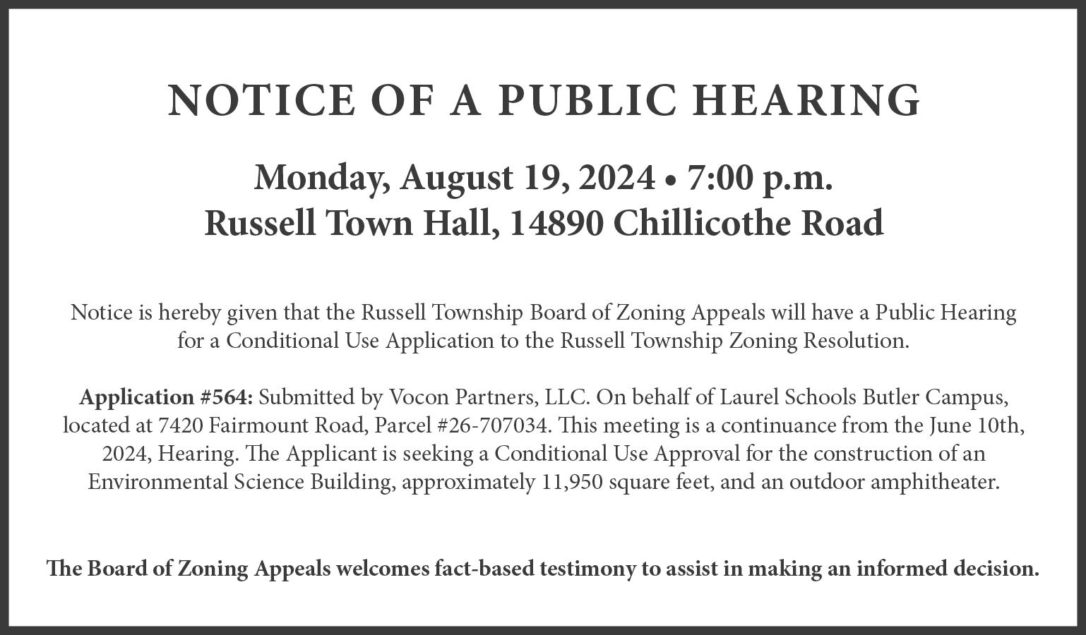 Village Council, 2025 budget hearing with county budget commission at Courthouse Annex, Chardon, 5:30 p.m. – Architectural Board of Review; Aug. 21, 7 p.m., Board of Zoning Appeals. All meetings are held at Village Hall, 5205 Chillicothe Road, unless otherwise noted.