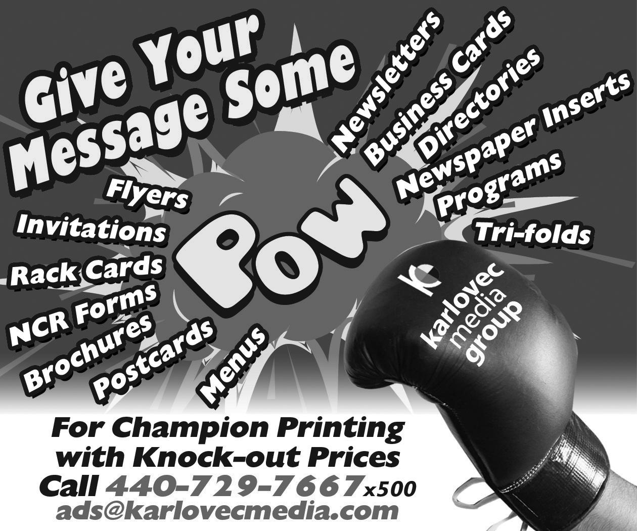 Did you know Karlovec Media Group prints business cards? Prices start at only $30 for 500 (B&W, 1-sided, no bleed). Call 440-729-7667 or email ads@karlovecmedia.com.
