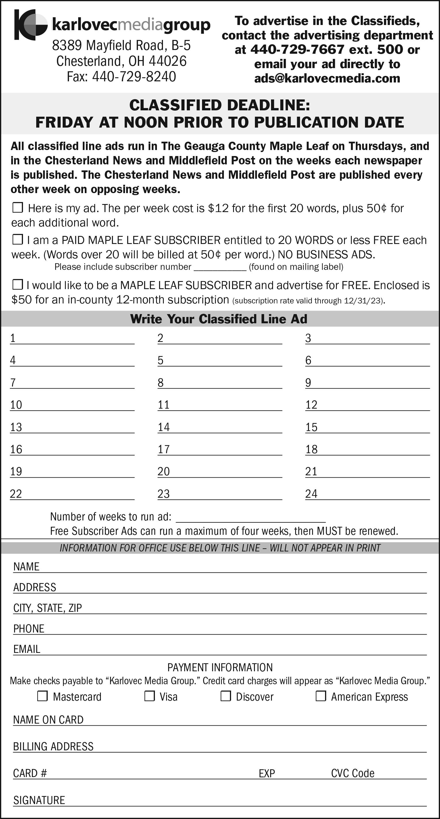 • The space reservation deadline for paid advertisements in that Thursday’s Geauga County Maple Leaf is the preceding Friday by noon. Late ads may be accepted at the discretion of management.