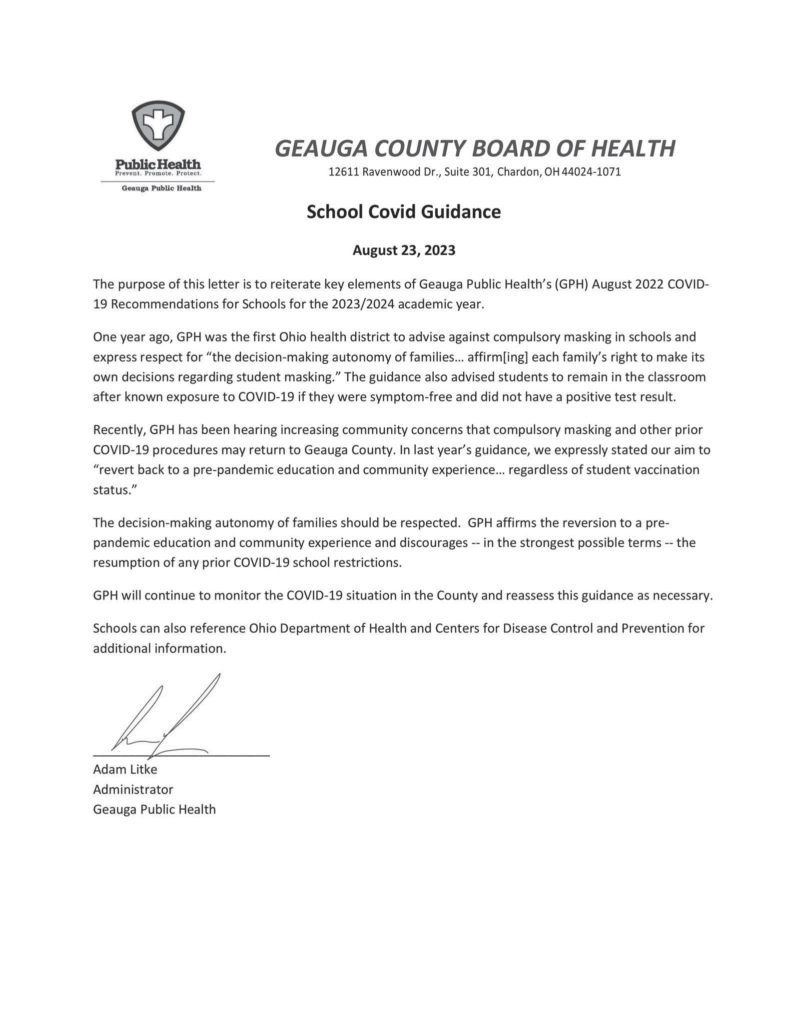 “Recently, GPH has been hearing increasing community concerns that compulsory masking and other prior COVID-19 procedures may return to Geauga County,” it continued. “In last year’s guidance, we expressly stated our aim to ‘revert back to a pre-pandemic education and community experience ... regardless of student vaccination status.’ The decision-making autonomy of families should be respected. GPH affirms the reversion to a pre-pandemic education and community experience and discourages — in the strongest possible terms — the resumption of any prior COVID-19 school restrictions.”