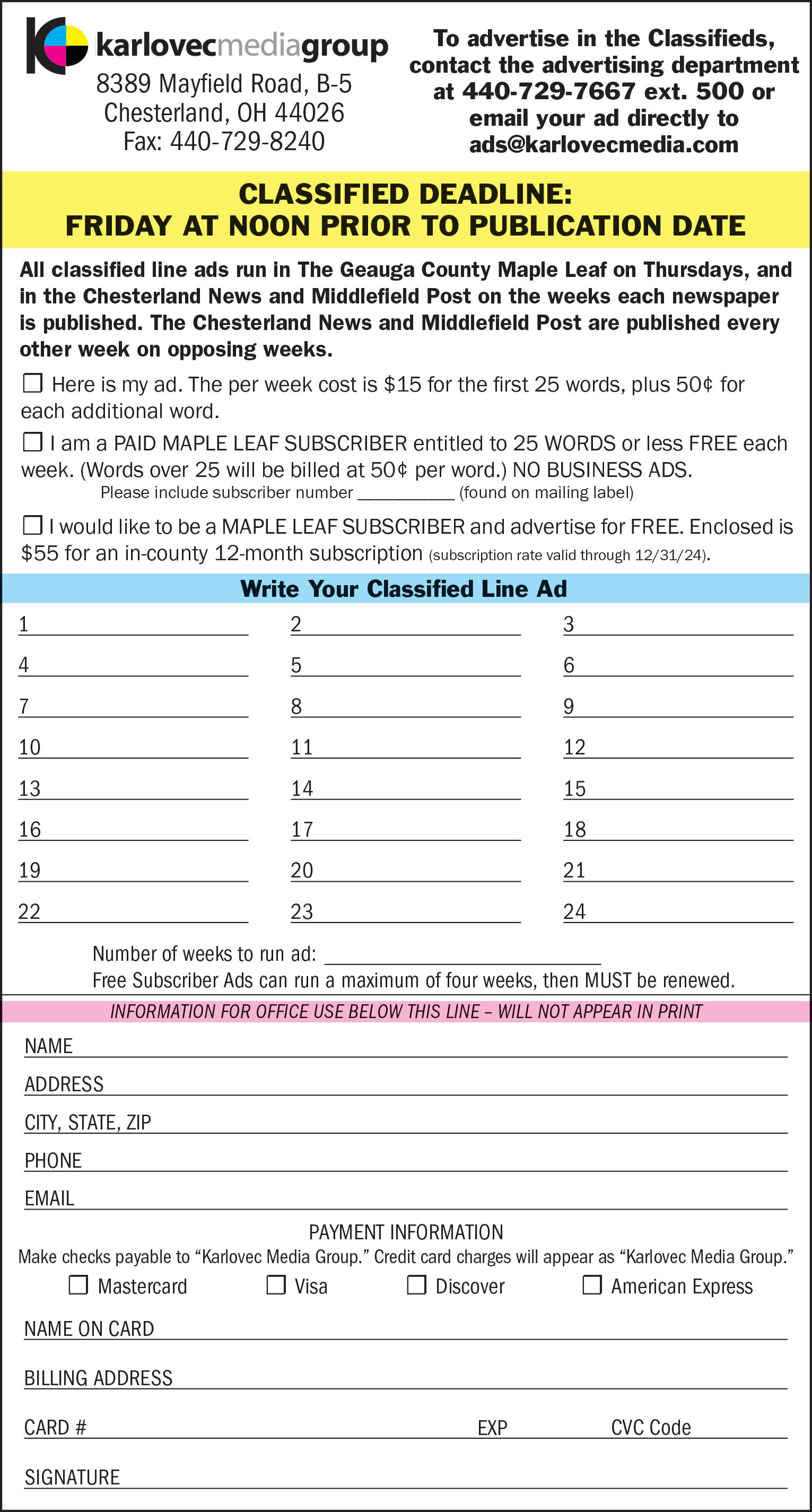 Here is my donation of $____________ Donations of $45 or more includes a choice of: ☐ 5 FREE Classified Ads in Middlefield Post ☐ 1 YR. Online Subscription to the Maple Leaf Please send this form and your contribution to: KARLOVEC MEDIA GROUP 8389 MAYFIELD ROAD, STE. B-5 CHESTERLAND, OH 44026 Middlef ield POST Community News from Middlefield, Parkman, Huntsburg and Surrounding Areas YES! I Want to Invest In My Community Name: ____________________________________________________________ Address: ___________________________________________________________ City: ____________________________________, Ohio ZIP: ________________ Phone: ____________________________________________________________ Email: ____________________________________________________________