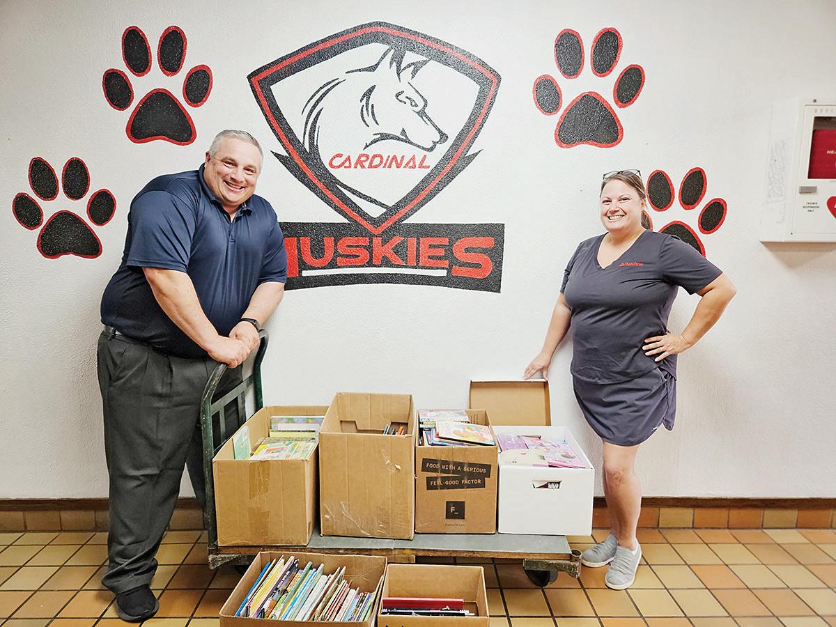 State Farm Insurance representative Shannan Jursa drops off books she collected through her #savethebooks project for disbursement during Jordak Elementary School’s School Supply Drop Off on Aug. 17. She is pictured with Principal Bob Kujala.