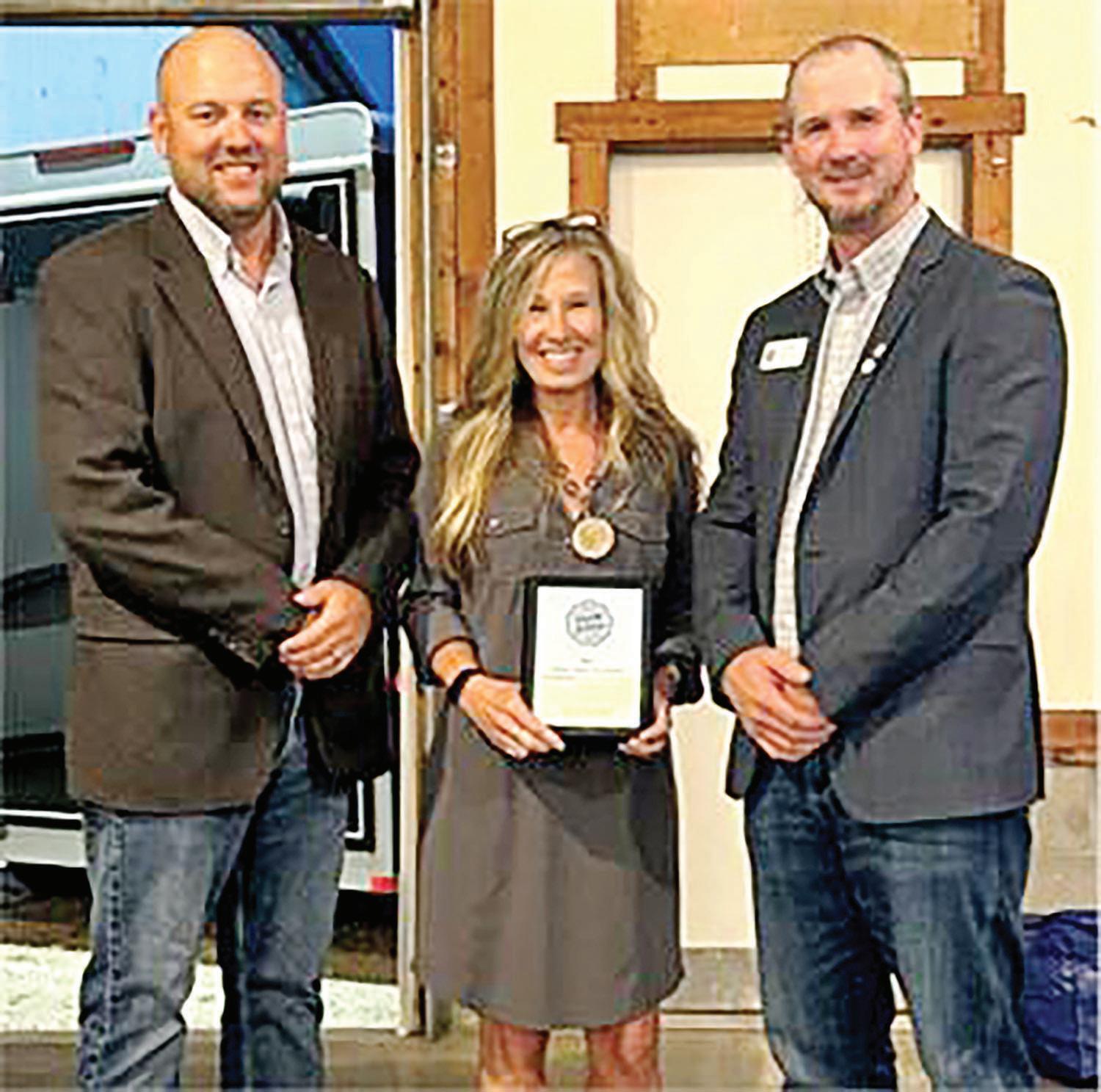 Katie Nainiger, center, Geauga Soil and Water Conservation District’s conservation education coordinator, has received the Geauga County Farm Bureau 2023 Distinguished Service for Agriculture Award. Geauga County Farm Bureau vice president Bob Rogish, left, and president Kevin Holy, right, presented the award during their annual meeting. Nainiger has collaborated with Farm Bureau on numerous education initiatives bringing an awareness and appreciation of agriculture to the young people of Geauga County. Her programs showcase the importance agriculture has on daily lives so future generations can carry it on.