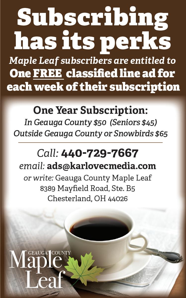 Did you know that Maple Leaf subscribers are entitled to one free classified line ad for each week of their subscription? Up to 20 words - perfect for selling personal items, vehicles or anything else you might have! An in-county one-year subscription is only $50 ($45 for seniors). Only $65 for those who live outside Geauga County or snowbirds. Call 440-7297667, email ads@karlovecmedia.com or write to Geauga County Maple Leaf, 8389 Mayfield Road, Ste. B5, Chesterland, OH 44026.