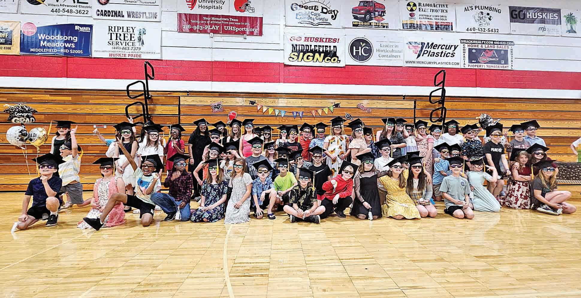 in caps and sunglasses in celebration of their fourth-grade graduation.