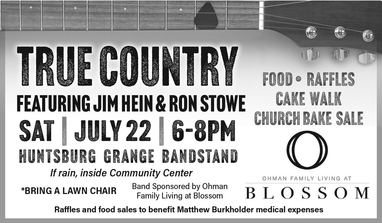 Huntsburg Grange’s bandstand concert with True Country will be sponsored by Ohman Family Living at Blossom. Bring a lawn chair and enjoy. Proceeds from Grange raffles and food sales will be donated to Huntsburg resident Matthew Burkholder for medical expenses. In case of rain, the concert will be held in Huntsburg Community Center.