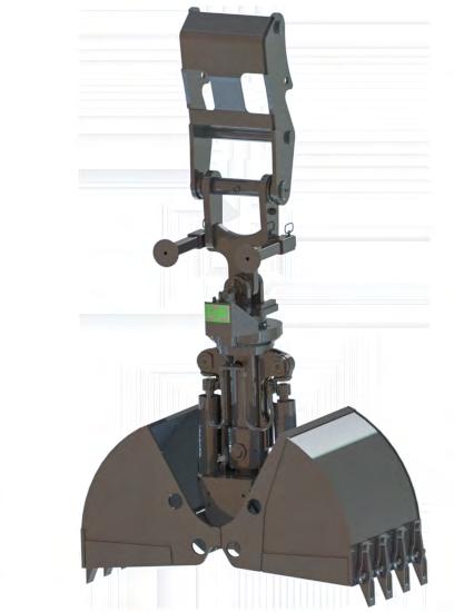 Die Drehbewegung wird mit einem robusten Stirnradgetriebe ausgeführt und kann damit endlos um 360° gedreht werden. Um dem Verschleiss und den hohen Kräften zu trotzen, werden die Schalen komplett aus Hardox gefertigt. Die schlanke Bauform der geschraubten Zähne verringert den Eindringwiderstand der Schalen auf ein Minimum.