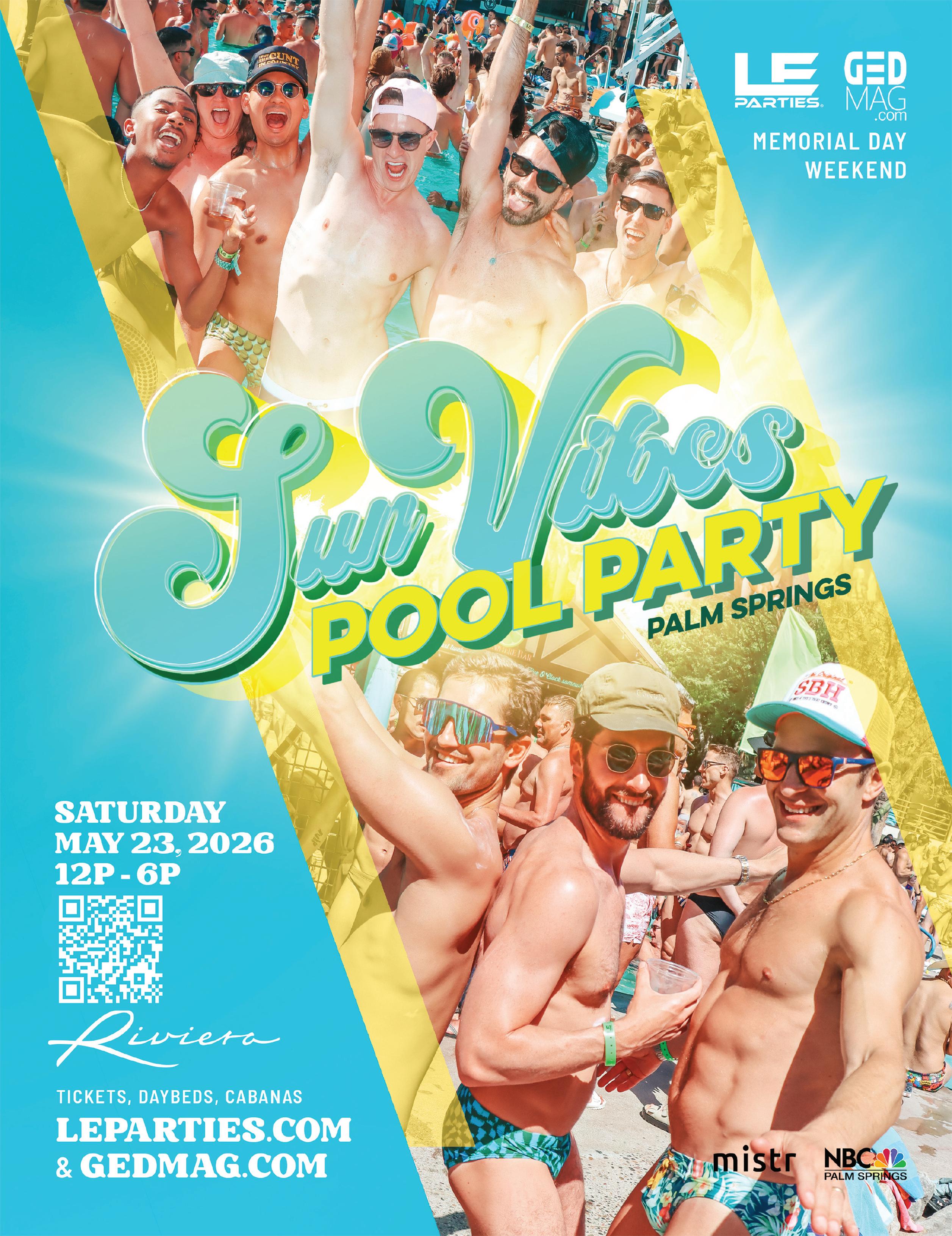 Spring is in full swing, with the days getting longer and temperatures getting warmer. So, our travel issue includes features on the Virgin Voyages LGBTQ group cruise to the Mexican Riviera with Expand Travel and GED Magazine, and the amazing Andalusian Coast of Spain for a gay getaway, just to start you thinking about planning some adventures. And speaking of warmer weather, that means pool party season is almost here, and the official start of summer with GED and LE Parties’ 4th Annual Sun Vibes Pool Party on Memorial Day Weekend (Saturday, May 23rd) at the Riviera Hotel and Spa Palm Springs. Visit GEDmag.com for Sun Vibes tickets and information.