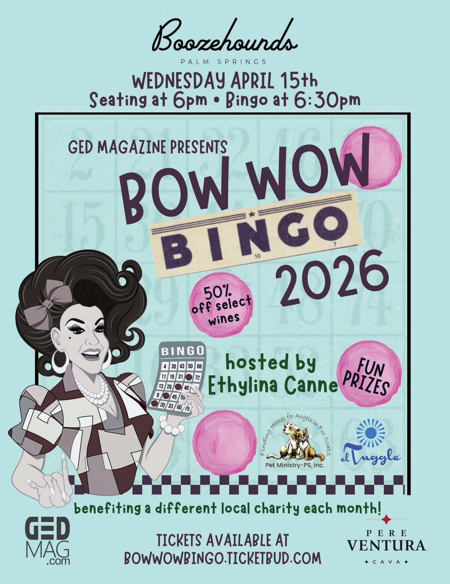 GED also presents two charity bingos each month – Ethyl’s Place Bingo at The Roost Lounge on the second Sunday of each month, and Bow Wow Bingo at Boozehounds Palm Springs on the third Wednesday of each month. Click “BINGO” on the menu bar at GEDmag.com and you’ll get the full calendar of happenings and ticketing. As always, the GED Magazine Team
