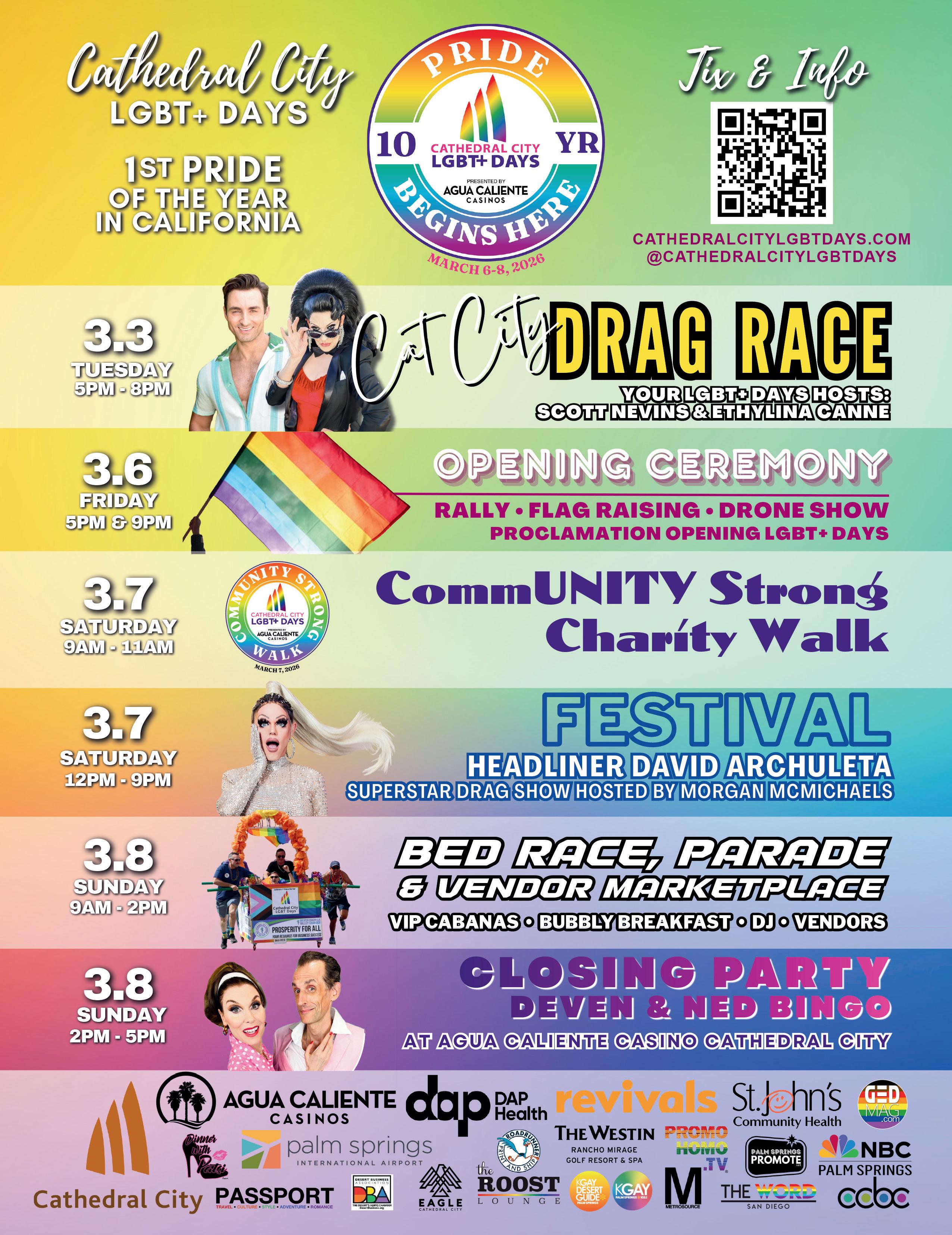 We are also excited to announce our media partnership with Cathedral City LGBT+ Days, with the 10th Annual event taking place March 3-8, 2026, with many new and enhanced events over the course of multiple days, including: Cat City Drag Race on Tuesday, March 3rd; PRO-Rally and Opening Ceremony on Friday, March 6th; Saturday March 7th Festival inside the Cathedral City Amphitheater with food and drink, vendors, and entertainment all day, including headliner David Archculeta; Sunday March 8th Bed Races with VIP Breakfast and Vendor Marketplace. Please visit cathedralcitylgbtdays.com for ticketing and more information.