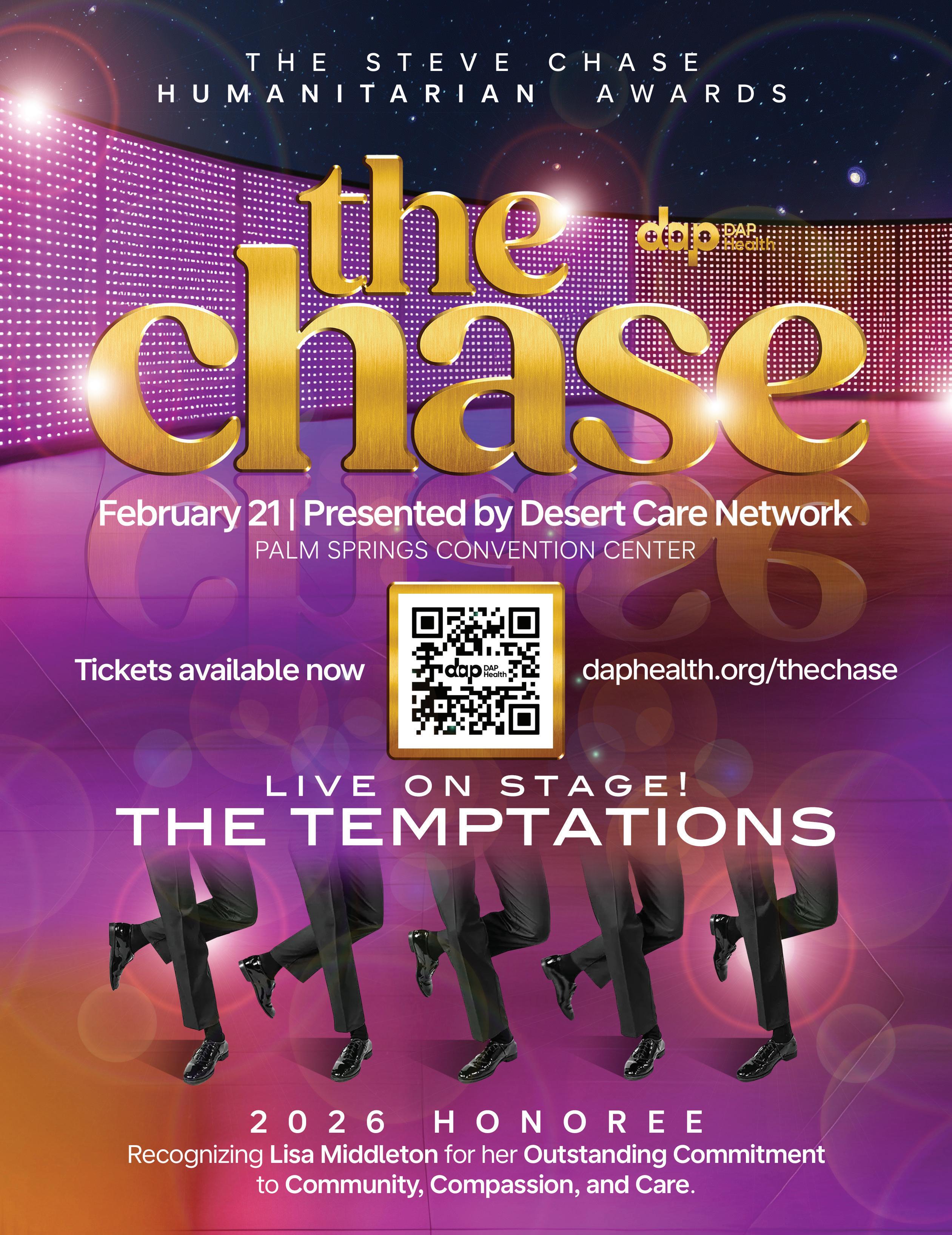 returns to its historic February timing — a reminder of the event’s origins and the community spirit that has sustained it for more than three decades. The first-ever annual fundraiser was known as Heartstrings and debuted on Valentine’s Day 1994. Proceeds from The Chase — including raffle ticket sales for the chance to win a diamond bracelet valued at $50,000, generously donated by El Paseo Jewelers — directly support DAP Health’s medical and support services, from HIV specialty care and sexual wellness to mental health, primary care, and gender-affirming services. This year’s Community Service Award will honor former Palm Springs mayor Lisa Middleton, whose leadership has long reflected values DAP Health holds close: inclusion, housing stability, and public service grounded in integrity. Headline entertainers The Temptations will add a celebratory note, all while underscoring the event’s deeper purpose — to sustain care that saves lives.