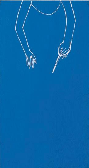 In der Nahsicht besonders auffallend an diesem Figurenbild sind die für Thiebaud typischen, mit starken, kontrastierenden Farben ausgeführten Umrandungen der Formen. Sie akzentuieren die Figur, umfassen aber auch die flache Ellipse des Schattens an der Wand und bringen so die beiden Bildebenen in ein spannungsvolles Gleichgewicht.