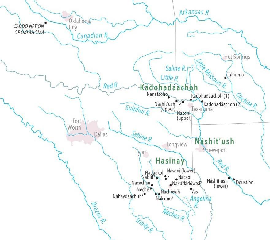 A MAP OF THE CADDO’S ANCESTRAL LANDS IN PRESENT-DAY EAST TEXAS, WESTERN LOUISIANA, SOUTHWEST ARKANSAS AND SOUTHEAST OKLAHOMA.
