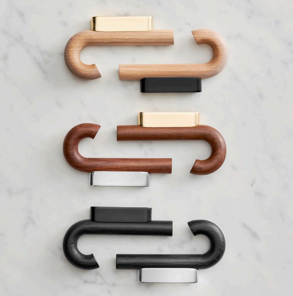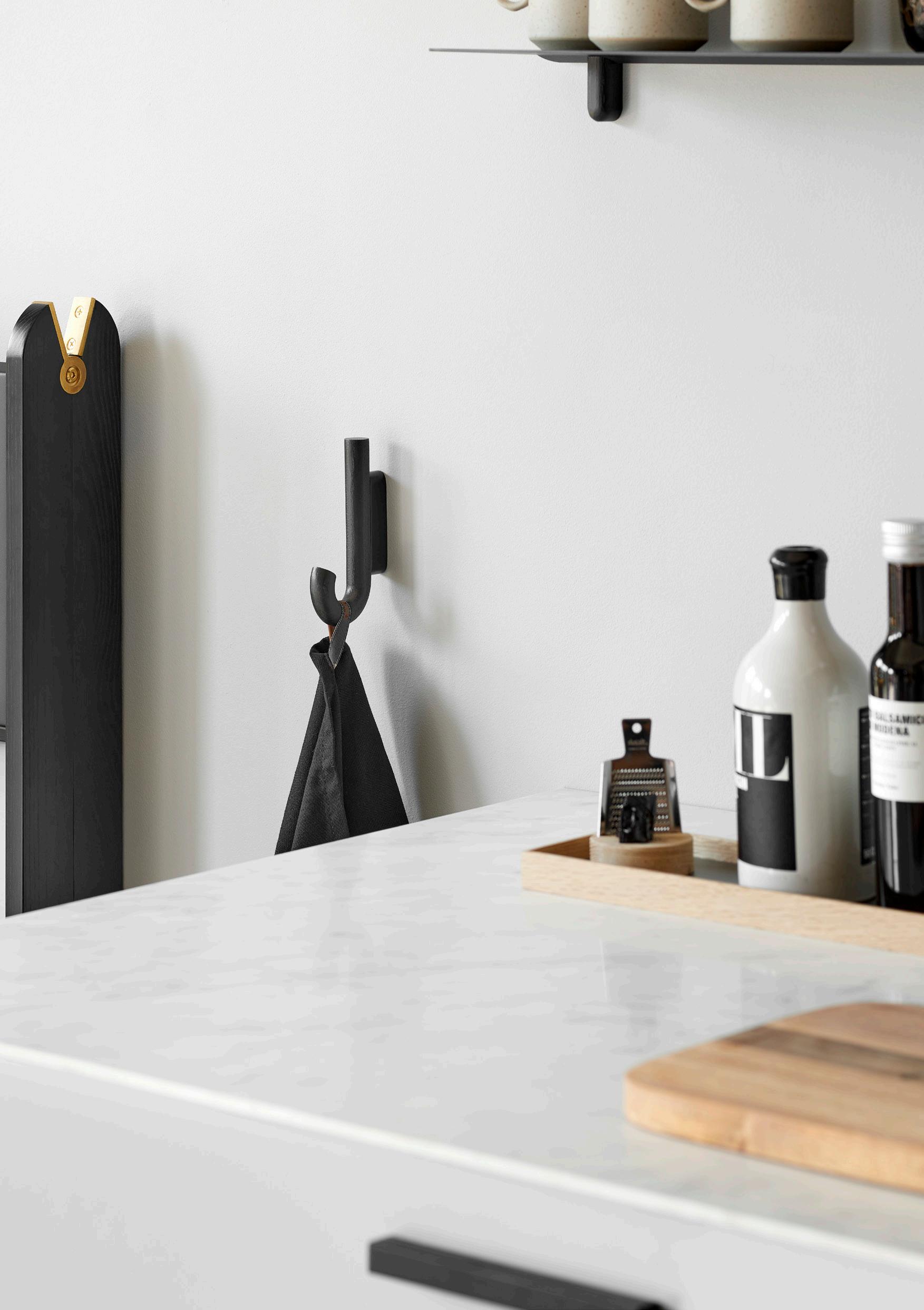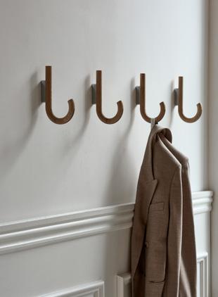 The straightforward design invites everyone to hang their jackets, bags, or umbrellas in the hallway. Hook mini can also hold tea towels or aprons in your kitchen or organize towels and bathrobes in your bathroom. The hangers are available in black oak, warm walnut or oak treated with white pigment and matt lacquer, all with beautiful details in wood, while the fittings are available in brass, chrome, and black metal.