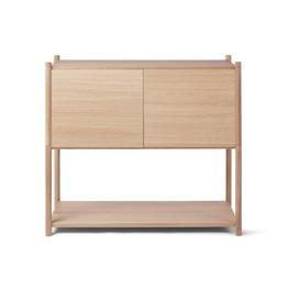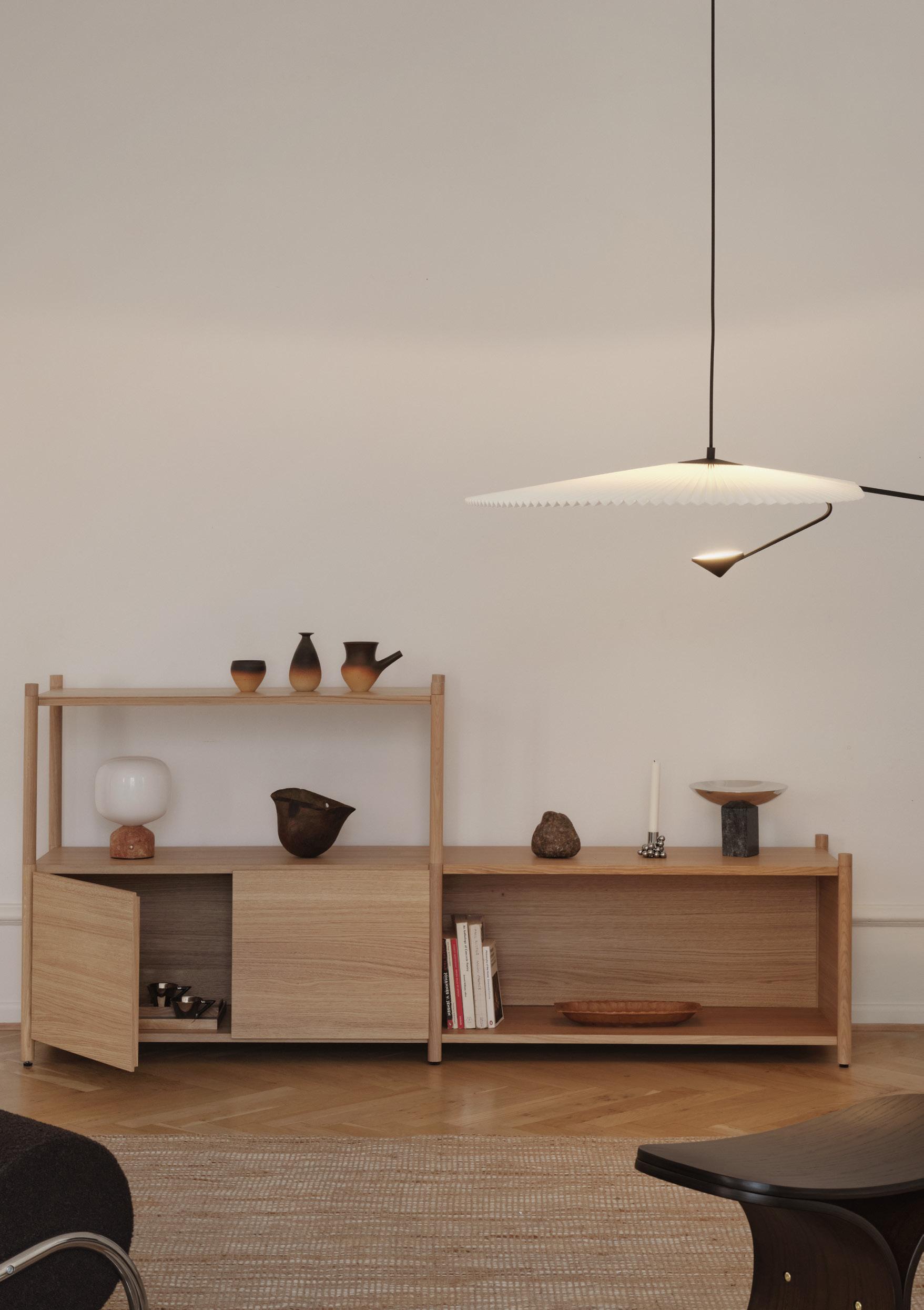 Sceene is a modular shelving system, designed by Michael Rem for Gejst. Module by module the shelving system can be build up high, extended to the sides and be customized with side panels, doors or back panels made in oak or upholstered with fabric in a selection of four beautiful colours. The idea behind Sceene is to create a frame to put the stories we form during our life on display. Our stories are captured in artifacts and objects full of sentimental value and with Sceene you can tell your stories exactly how you want.