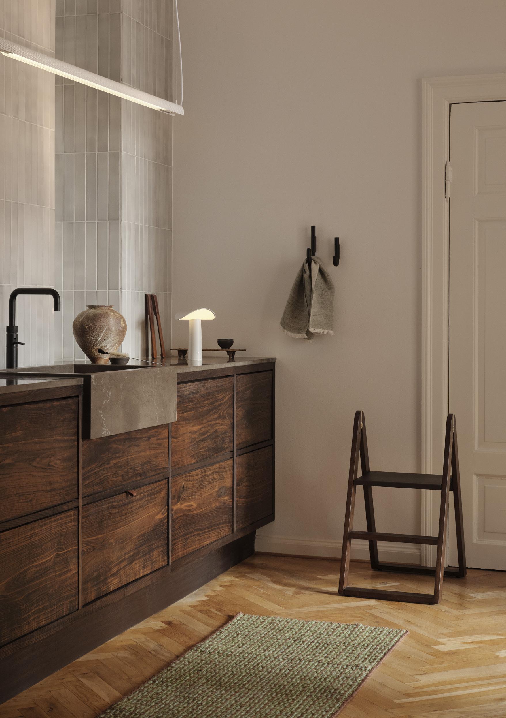 The inspiration behind Reech step stool comes from the Nordic lifestyle, and its design exudes both functionality and aesthetics, making it an ideal addition to any home that values quality and durable design. The thoughtful design of Reech step stool includes innovative solutions such as the small round push button, ensuring that the top step remains secure when the stool is folded. The beautiful brass closure adds an exclusive touch, making Reech step stool truly special. The Reech step stool is also ideal as a spacesaving solution and, like its big brother, comes with a bracket so it can be hung on the wall or stored away in the cabinet..