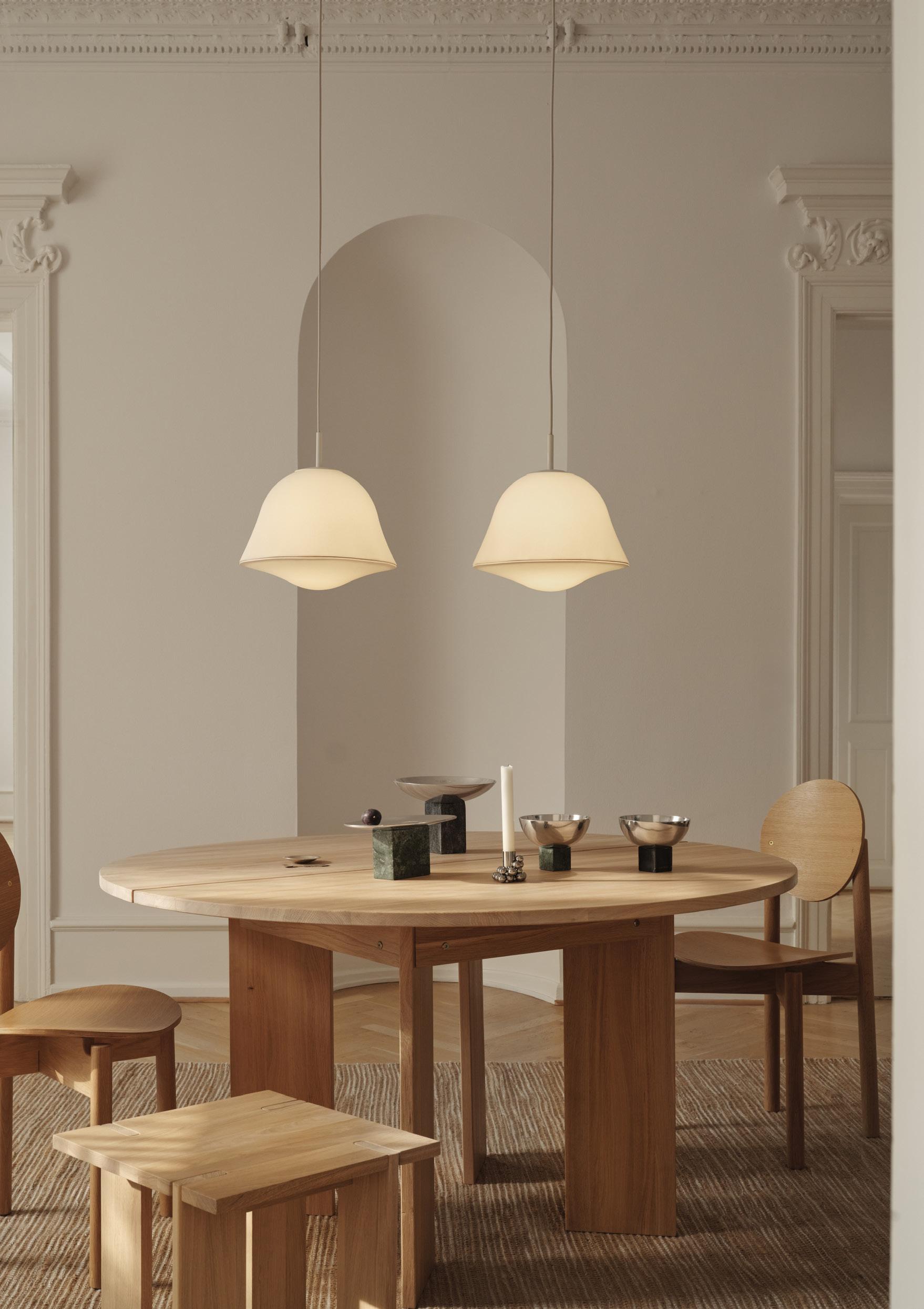 Caly is a sculptural pendant where form is created through the tension of fabric. What began as a playful exploration of stretchable textiles evolved into a refined and poetic design that balances light, volume and material in a calm, timeless expression. Elegant and versatile, Caly feels at home above dining tables, in bedrooms and hallways as well as in larger spaces such as hotels and offices. Used individually or in clusters, the pendant adds both atmosphere and architectural presence. The light spreads softly and evenly through the textile - almost like studio light - creating a warm and welcoming ambience. The carefully selected fabric combines stretchability, bright whiteness and subtle texture, ensuring both technical performance and a rich, tactile character.