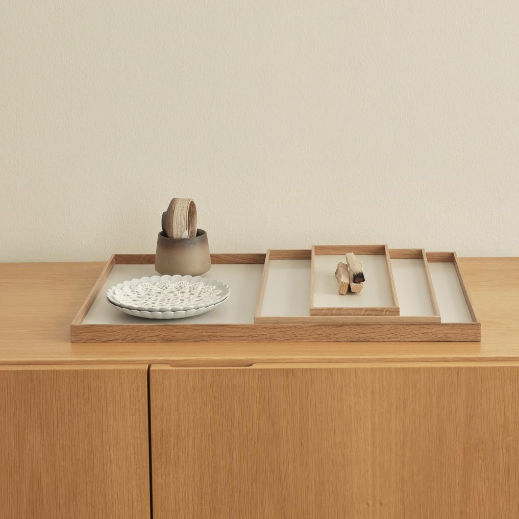 The Frame trays are meant to function as a frame and foundation for the exhibitions we create in our homes. Frame tray is made of painted waterproof mdf plate with hardwood sides. Frame trays are made of a colored water-resistant mdf plate with wooden edges. Available in 3 colours with either oak or smoked oak frame. Frame trays are available in 3 sizes.