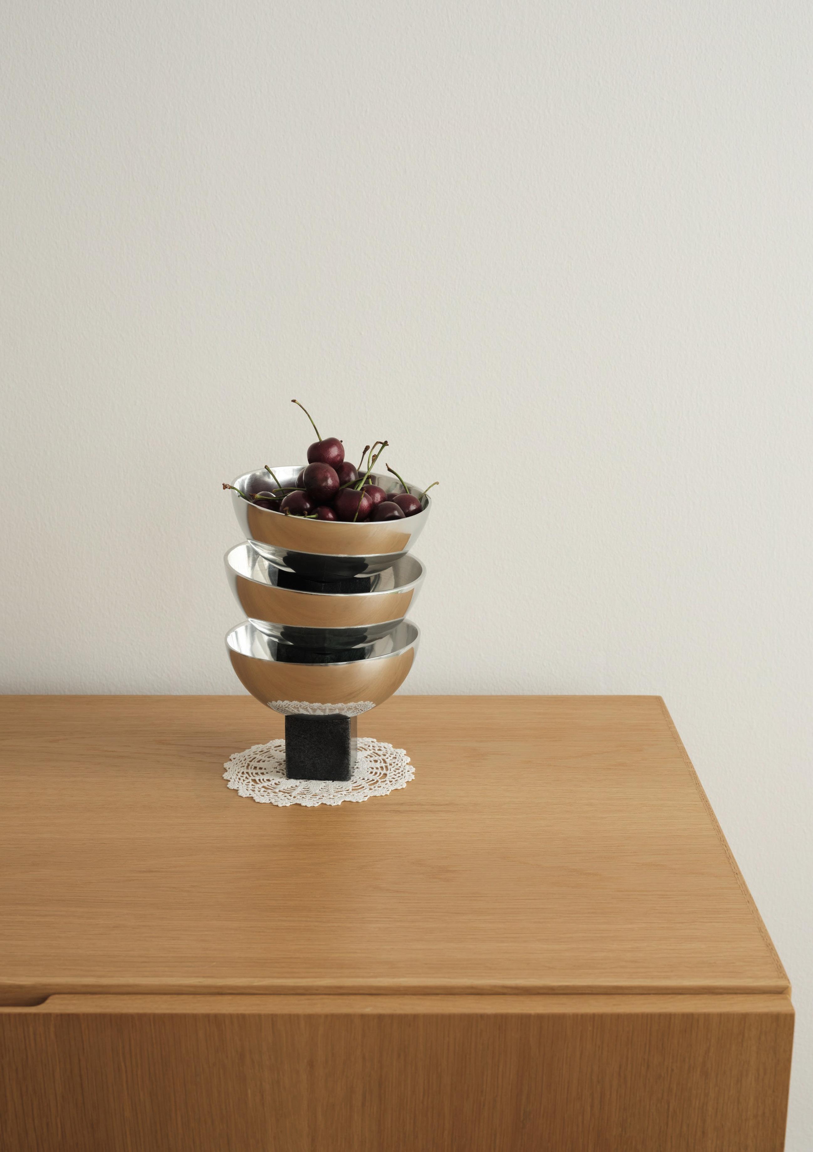 Sapoto is a beautiful collection of bowls and a serving tray. The Sapoto bowls are polished to a mirror shine, giving the raw sandcasting method a beautiful contrast to the dark marble of the plinth. The Sapoto series consists of objects that arouse curiosity. Invite us to touch. To pick them up. To share. The bowls can be used individually or in a group, where their interaction heightens the experience. Sapoto is perfect for serving food, storing small items and as sculptural objects.