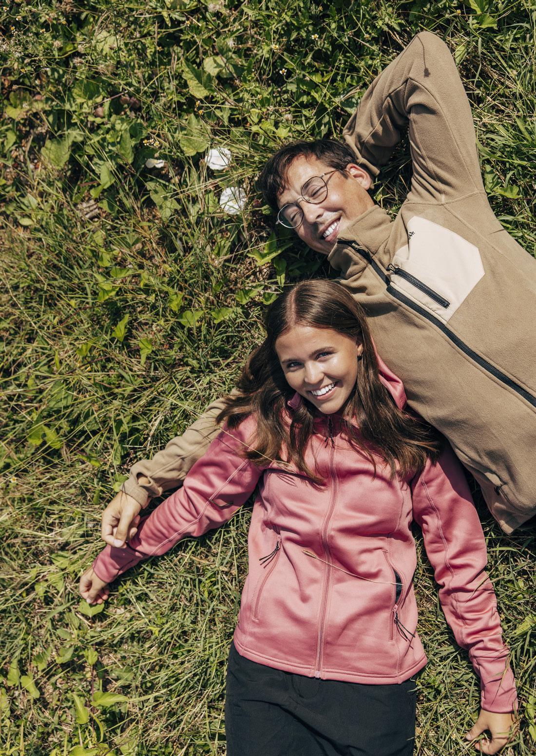 Lättviktsdunjackan, som finns i rosa och marin, är perfekt för svala sommarkvällar.