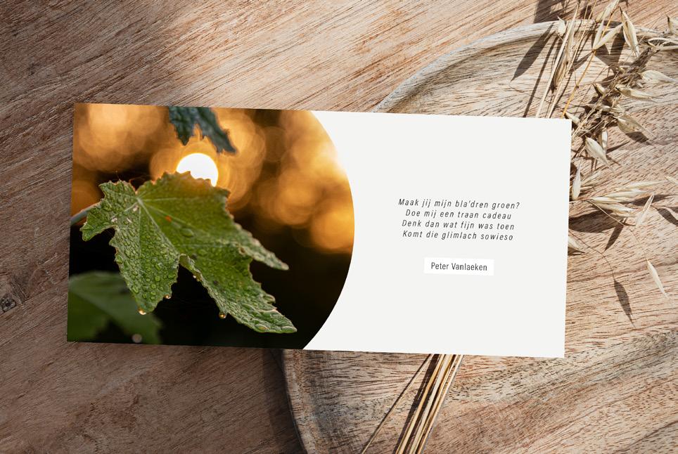 Onze troostkaarten worden steeds van prachtige foto’s voorzien dankzij de lokale fotoclub van Deerlijk. Beschik jij ook over kwalitatieve, professionele foto’s die je graag met ons deelt voor op de kaarten? Fijn! Stuur ze gerust door op communicatie@deerlijk.be. Uit alle foto’s maken we een selectie voor op de kaarten.