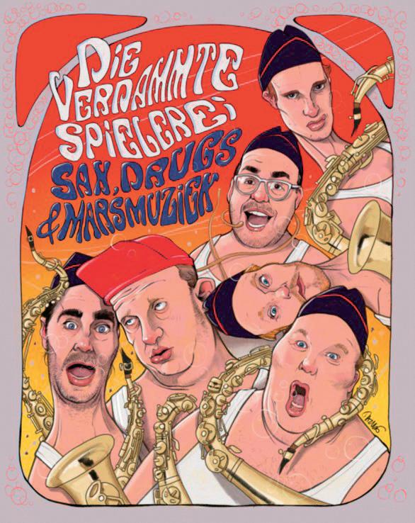 Het is tijd om op te staan en ten strijde te trekken tegen verveling, tegen pessimisme, tegen saaiheid, tegen verdriet, voor de liefde, de vrede en de samenleving! De 6 mannen, van Die Verdammte Spielerei gaan u voor en vormen een hechte bende vol vriendschap, muziek en liefde; (elk met hun eigen kracht en instrument). In de nieuwe voorstelling ‘Sax, drugs & marsmuziek’ regent het oplossingen voor alle kleinmenselijke problemen.