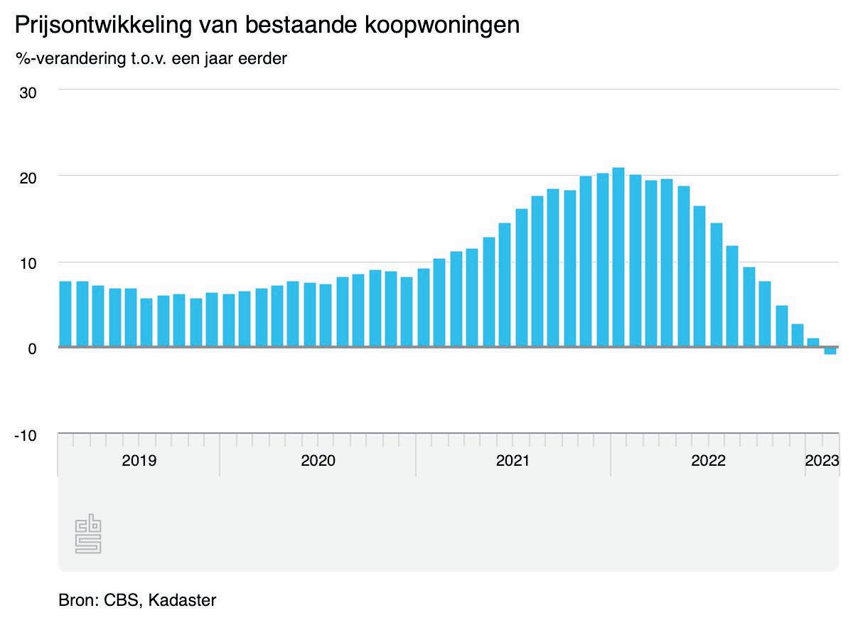 NEDERLAND In februari 2023 waren de prijzen van koopwoningen voor het eerst sinds april 2014 lager dan in dezelfde maand een jaar eerder. Bestaande koopwoningen waren gemiddeld 0,8 procent goedkoper dan in februari 2022. Dit blijkt uit onderzoek naar de prijsontwikkeling van bestaande particuliere koopwoningen in Nederland van het CBS en het Kadaster.