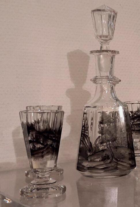 ?Wir haben bei einer Flohmarktveranstaltung eine Karaffe mit vier dazugehörenden Gläsern gekauft Die Verzierungen sind feine Malereien in schwarzer Farbe Gerne würden wir mehr über Verwendung solcher Gläser wissen und über den Zeitraum, in dem diese Gläser hergestellt wurden Auch was diese Gläser zusammen in etwa wert sind, ist interessant für uns Familie Hofmann aus Franken