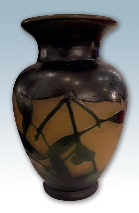 !Dieformgeblasene Vase mit geätztem Überfang kann gut datiert und zugeschrieben werden und zwar anhand der Signatur „d’Argenthal“ mit dem Lothringer Kreuz Sie stammt von dem zum Architekten ausgebildeten französischen Glaskünstler und Maler Paul Nicolas und wurde zwischen 1919 und 1925 hergestellt 1893 trat Paul Nicolas in die Manufaktur von Emile Gallé in Nancy ein und erhielt dort eine Ausbildung zum Glasschneider Gallé hielt große Stücke auf Paul Nicolas Beide Glaskünstler hatten ein ausgeprägtes Interesse an Botanik und schufen durch ihr intensives Studium der Natur einen vielseitigen Motivkanon für die Dekore des Jugendstilglases in Nancy Auf der Pariser Weltausstellung 1900 waren viele ihrer Vasenschöpfungen in der Unternehmenspräsentation von Emile Gallé zu sehen und erhielten hohe Auszeichnungen Nach dem Tod von Gallé im Jahr 1904 führte Paul Nicolas die Gallé-Manufaktur zunächst weiter 1919 gründete er dann seine eigene Manufaktur und diese nutzte bis 1925 genau die Signatur, die auf Ihrer Vase zu sehen ist: „d’Argenthal“ und das Lothringer Kreuz Die Vase erzählt auch von dem Naturstudium der Jugendstilglaskünstler. Ihre Wandung zieren grüne Mistelzweige, die die Schule von Nancy sehr oft als Dekormotive verwandte Die Technik des Überfangglases ist kennzeichnend für die Glaskünstler dieser Epoche und Region. Die innere Glasschicht einer Überfangvase wird