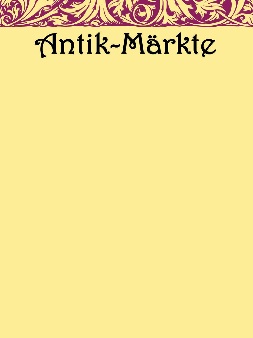 ANTIKMARKT Sonntag, 08. Jan. 23 im größten und schönsten Einkaufscenter im Kreis Recklinghausen • Im Zentrum von Marl • über 2000 kostenlose Parkplätze • erstklassiger Standort • jeden ersten Sonntag im Monat Info: St. Kleingries • Tel. 01578/3754700 Auf beiden Etagen 20,- Euro der laufende Meter 14./16. April 2023 Internationale Antik Uhrenbörse Internationale Antik Uhrenbörse 14./16. April 2023 79871 Eisenbach Wolfwinkelhalle Info & Anmeldung: info@uhrenstammtisch-waldkirch.de www.eisenbach-antikuhrenboerse.de Montag, 26.12.2022 A2-Center Altwarmbüchen Sonntag, 19.02.2023 Planetencenter Garbsen So., 12.02.2023 + So., 12.03.2023 A2 Center Altwarmbüchen 27. Mai bis 29. Mai 2023 allerART Celler Schloss So., 05.02.2023 + So., 05.03.2023 CCL Center Langenhagen Sonntag, 19.03.2023 CD Kaserne Celle Weitere Infos unter 0176/23122855 www.Grimm-Veranstaltung.de Vorraussichtliche Termine 2023: 22_28_BS_0123.qxp_Layout 1 28.12.22 11:06 Seite 1