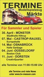 B Tongeren Centrum T Info: 0032-12-390255 L Remich Kons-Platz T Sammlerclub 0352-621532774 NL Amsterdam Olympisch Stadion T Organ. Don 0031-294-233654 NL Brunssum Hallen Zwarte Markt T Euregiobazaar 0031-64-5459010 NL Eindhoven Kunstijsbaan T van Aerle 0031-492-525483 NL Enschede H.J.v. Heekplein T ReZi 0031-6-26222593 NL Exloo rondom de oude Brink T Hofman 0031-6-55918736 NL Hoogvliet Middenbaan Noord T Beukers 0031-6-50583127 NL Horst Evenemententerrein van het Kasteelpark T Mcc Events 0031-654345123 NL Koog aan de Zaan Buurthuis de Vuister Modellbahnbörse Eurospoor 0031-299-640354 NL Leidschendam Kennedyplein T Organ. Don 0031-294-233654 NL Norg Centrum Brinkhofweide T Impuls 0031-6-19186120 NL Rotterdam Afrikaanderplein T Roodbol 0031-6-53777967 NL Waalwijk Parkeerterrein langs Piet Klerkx T De Evenementenlijn 0031-416-530502 NL Weerselo Halle und Freigel. Bornsestraat T Busscher 0031-5416-661285 NL Wervershoof Recreatiegebied Nesbos T Mikki 0031-229-244739