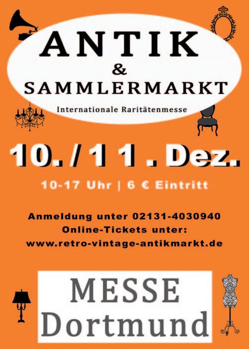 FREITAG 13. JANUAR 2023 90 Nürnberg Art & Antique Antikmesse 1.T. Interantik 02131-403094-0 SAMSTAG 14. JANUAR 2023 90 Nürnberg Art & Antique Antikmesse 2.T. Interantik 02131-403094-0 SONNTAG 15. JANUAR 2023 28 Bremen Weserpark Interantik 02131-403094-0 65 Wiesbaden Adler Center, Äppelallee Melan Rhein-Main 02401-8048850 90 Nürnberg Art & Antique Antikmesse 3.T. Interantik 02131-403094-0 SONNTAG 22. JANUAR 2023 60 Frankfurt Hessen-Center Interantik 02131-403094-0 91 Rothenburg o.d.T. Kaufland + Parkhaus Enkler 09852-908975 SAMSTAG 28. JANUAR 2023 04 Leipzig-Markkleebrg. agra Gelände Bornaische Str. 1.T. Seifert 0341-9804817 SONNTAG 29. JANUAR 2023 04 Leipzig-Markkleebrg. agra Gelände Bornaische Str. 2.T. Seifert 0341-9804817 20 Hamburg Alstertal EKZ Interantik 02131-403094-0 FREITAG 2. DEZEMBER 2022 45 Mülheim/Ruhr Alte Dreherei Modellspielzeugmarkt 1.T. Breidenbach 02553-98773 90 Nürnberg Messe Retro Classics Bavaria 1.T. Automania 0172-6826660 SAMSTAG 3. DEZEMBER 2022 10 Berlin-Karlshorst Trabrennbahn Berliner Spielzeugbörse 1.T. Oldthing 030-29002010 ANTIKMÄRKTE & KUNSTMESSEN 24 NEUER N E U E R GR G R O S SER S E R ANTIK A N T I K- und u n d SAMMLERMARK S A M M L E R M A R K T Kaue CreativQuartier Fürst Leopold Dorsten, Fürst Leopoldplatz 1 So. 30.10. + 27.11.2022 46284 DORSTEN Laufender Meter 23,- Euro, Anmeldung erforderlich Parkplätze frei, Eintritt 2,- Euro Kontakt: Veranstaltungsagentur Stephanie Kleingries Mobil 01578 3754700 . info@va-kleingries.de Kaue Zeche Fürst Leopold Dorsten ANTIKMARKT Sonntag, 04. Dez. 22 im größten und schönsten Einkaufscenter im Kreis Recklinghausen • Im Zentrum von Marl • über 2000 kostenlose Parkplätze • erstklassiger Standort • jeden ersten Sonntag im Monat Info: St. Kleingries • Tel. 01578/3754700 Auf beiden Etagen 20,- Euro der laufende Meter SAMMLERBÖRSEN ANZEIGENSCHLUSS FÜR DIE JANUAR-AUSGABE IST FREITAG, DER 2.12.2022 14./16. April 2023 Internationale Antik Uhrenbörse Internationale Antik Uhrenbörse 14./16. April 2023 79871 Eisenbach Wolfwinkelhalle Info & Anmeldung: info@uhrenstammtisch-waldkirch.de www.eisenbach-antikuhrenboerse.de