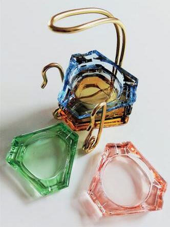 Es gibt diverse verschiedenfarbige kleine Aschenbecher, in metallenen Haltern gestapelt, die beinahe zu klein erscheinen, um benutzt zu werden Und viele der Glaswaren dieser Zeit sind in ihrer ursprünglichen Funktion inzwischen vollkommen in Vergessenheit geraten Dazu zählen kleine Blumenväschen, die in Messinghalterungen für Wand und Tisch angeboten wurden, Zigarettenspender oder „Brezelhalter“ mit kleinen Gefäßen für Partygebäck Im Gebrauchtwarenhandel, speziell, wenn die jüngere Generation die ihnen unbekannten Objekte sichtet und präsentiert, landen diese Halterungen oft in unspezifischen Haufen aus Metall Oder die Halte-Ringe werden mit nicht-originalen Gefäßen bestückt, die von der Form halbwegs zu passen scheinen Manchmal findet sich dann ein Regal weiter bei den Glaswaren noch das passende Einsatz-Stück, da braucht’s vielleicht ein Stückchen Glück