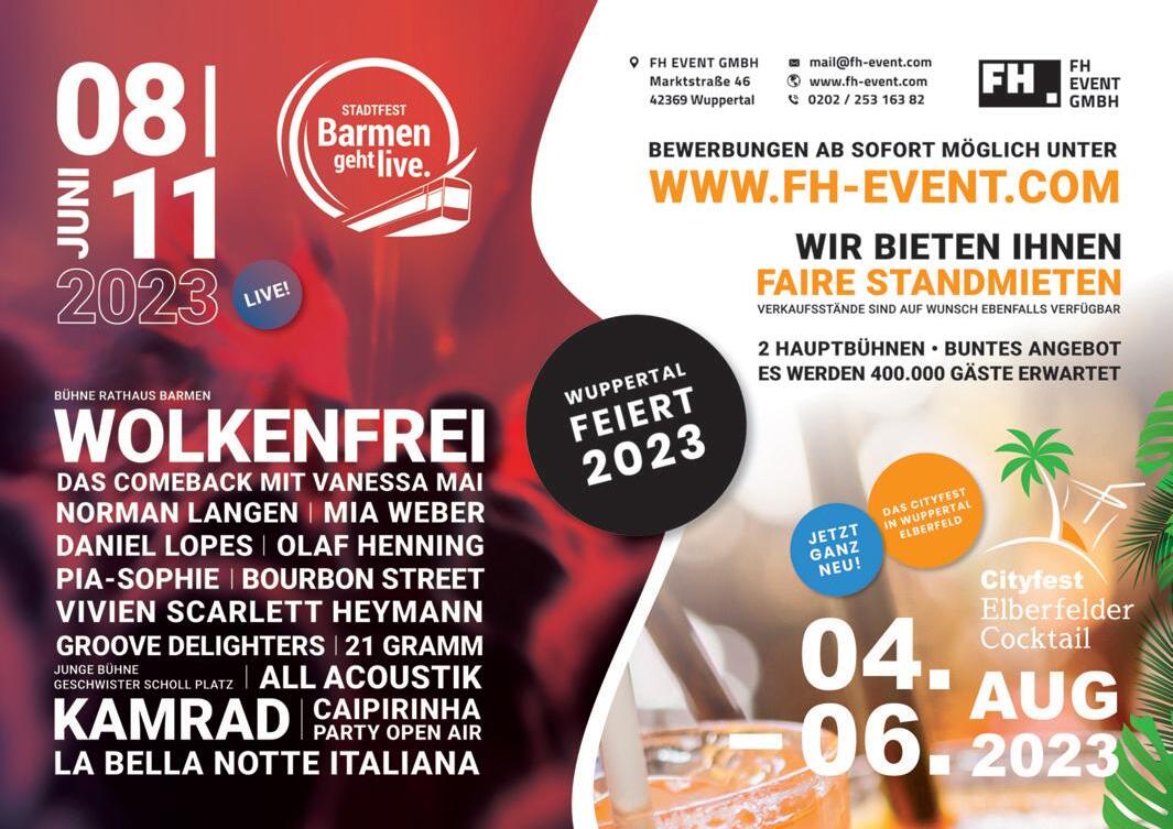 Zwei Stadtfeste werfen ihre Schatten voraus: Das Stadtfest Barmen live, vom 8 bis 11 Juni 2023, sowie das Cityfest Elberfelder Cocktail, vom 4 bis 6 August Die beiden Wuppertaler Großveranstaltungen un-