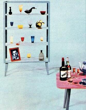 Pastelltöne dominierten ab den frühen 1950er-Jahren in der Wohnwelt, und der gedeckte Tisch bot sanfte, harmonische Töne Die Zartheit und scheinbare Zerbrechlichkeit, die sich in den fragilen, oft nur dreibeinigen Holzgestellen von Stühlen und Tischen zeigte, wurde kombi-