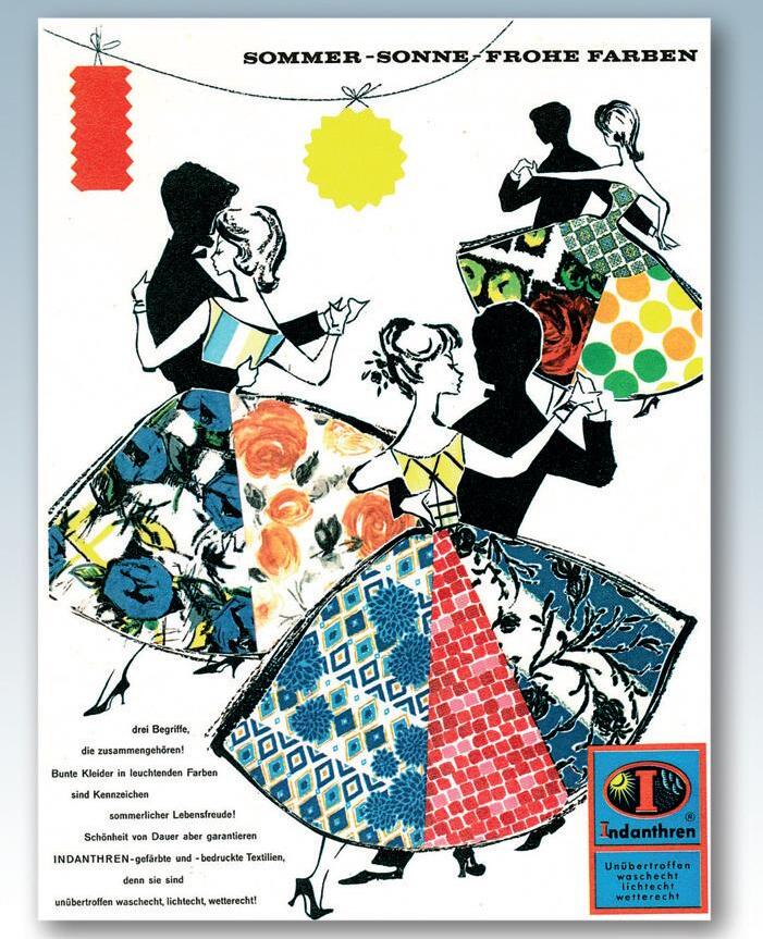 Aber ab Mitte der 1950er-Jahre zeigt sich dann in den Zeugnissen der „Indanthren“Reklame wieder die Fröhlichkeit und Leichtigkeit der 1920er-Jahre Die Anzeigen des Wirtschaftswunders sind beschwingt und die angepriesenen Stoffmuster präsentieren eine breite Vielfalt von Farbigkeit und Motiven Selbst eine FlexiSingle wurde gegen Ende der 1950erJahre vom „Indanthren-Warenzeichenverband“ herausgegeben und als Werbegeschenk verteilt Hier sang der Schlagerstar Ruth Fischer begleitet vom „Electrola“Tanzorchester „Du bist noch viel zu jung für mich“