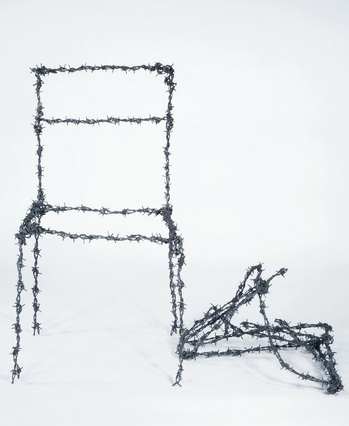Arik Levy hat am Art Center, College of Design in La Tour-de-Peilz, Schweiz, Industriedesign studiert Dort entwickelte er einen Ansatz, der Kunst und Design miteinander vereint Für den Gestalter „manifestieren sich im Stuhl BarbedWire die gesellschaftlichen Codes, die unser Denken, unsere Gefühle und unser Sozialverhalten konditionieren“ Der Stuhl „BarbedWire Chair“ vermittelt Unbehagen, Instabilität, Gefahr und sogar Aggression Der Stuhl verweist auf räumliche Einschränkungen und bewachte Grenzposten Wer sich auf diesen Stuhl setzt, erfährt Leid und Schmerz, wodurch Vorstellungen von religiöser Buße geweckt werden BarbedWire Folded Chair hat seine Funktion als Sitzgelegenheit vollständig verloren und gerät zu