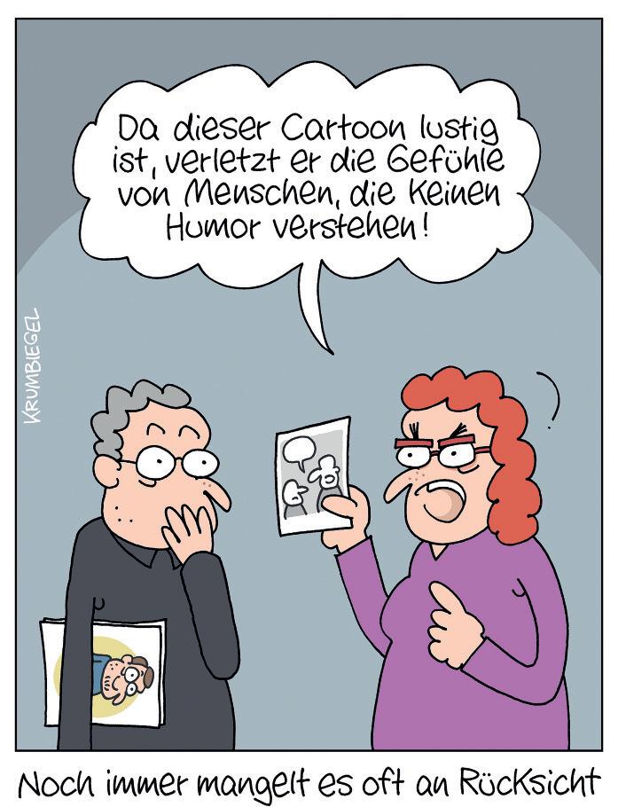 Uwe Krumbiegel, Noch immer mangelt es oft an Rücksicht, 2022, Tuschestift, digital koloriert; Satiricum Greiz © U. Krumbiegel