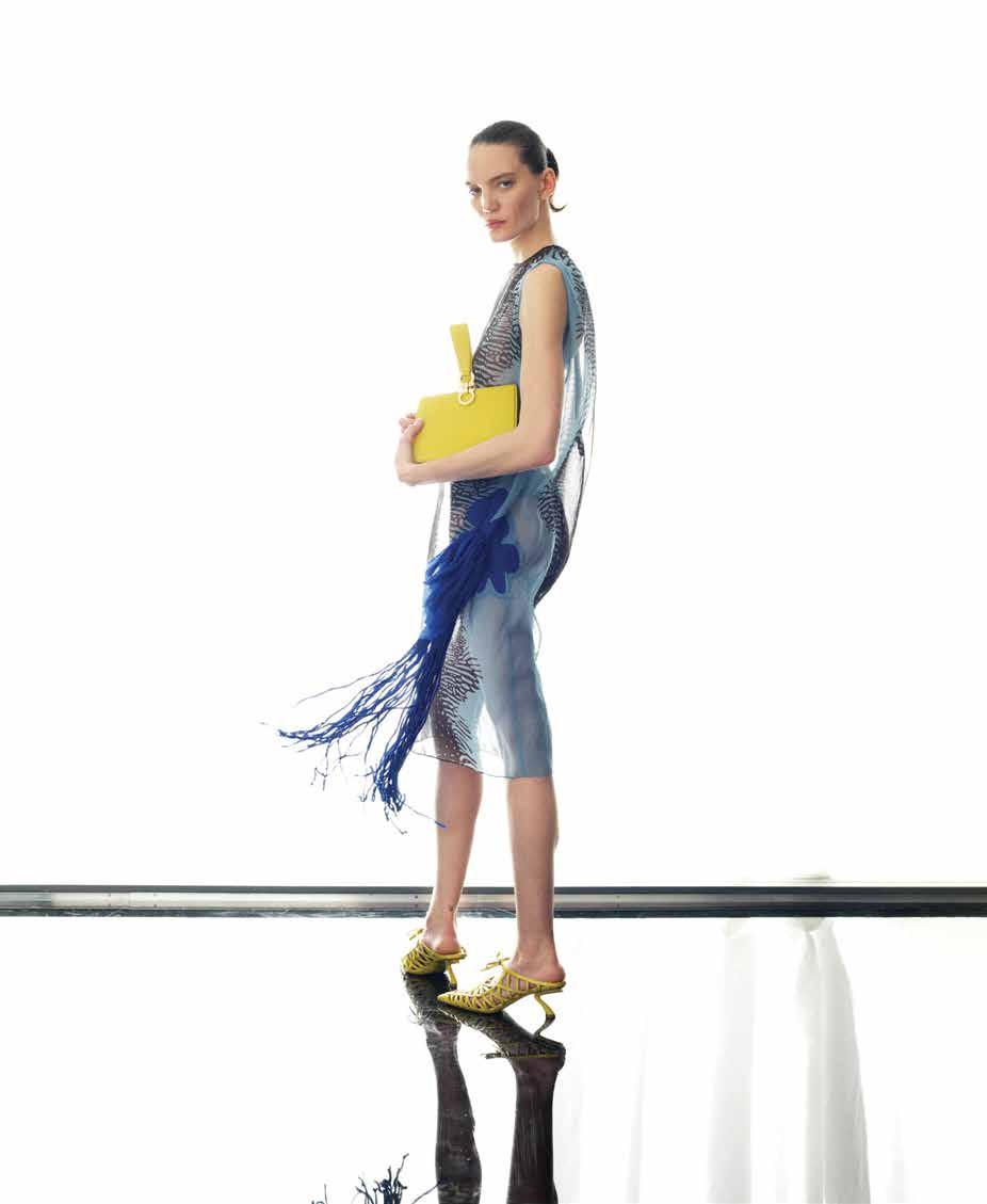 FERRAGAMO DRESS $2800; FERRAGAMO S-SHAPE HEELED MULE, $1690; FERRAGAMO YELLOW MINI CLUTCH, $1650, FERRAGAMO.COM