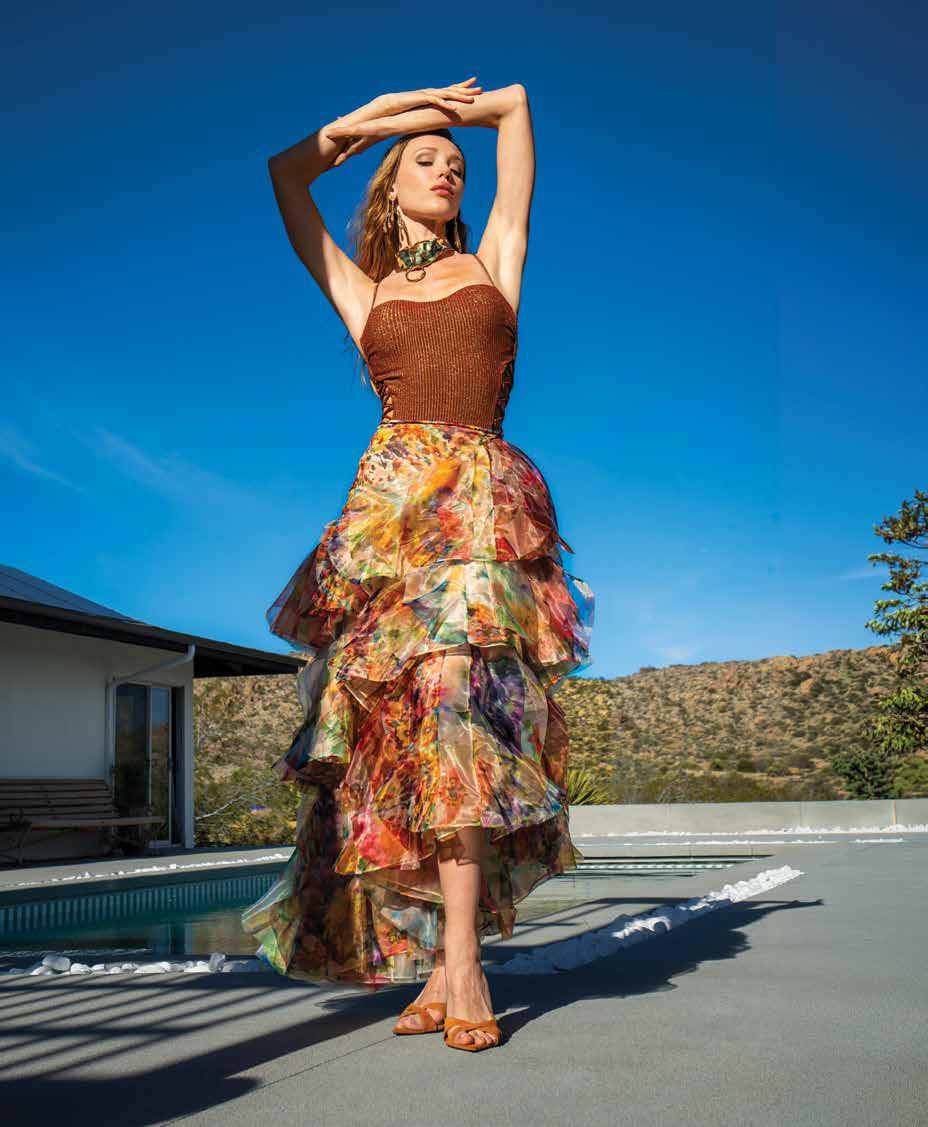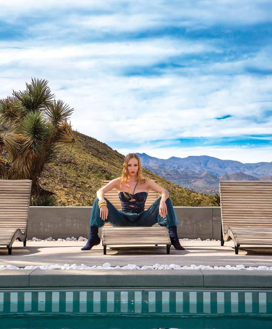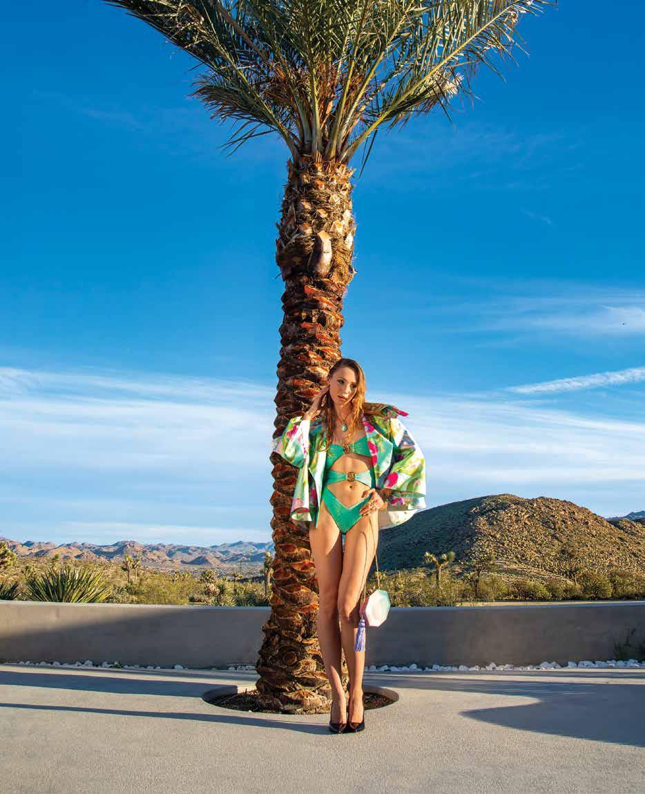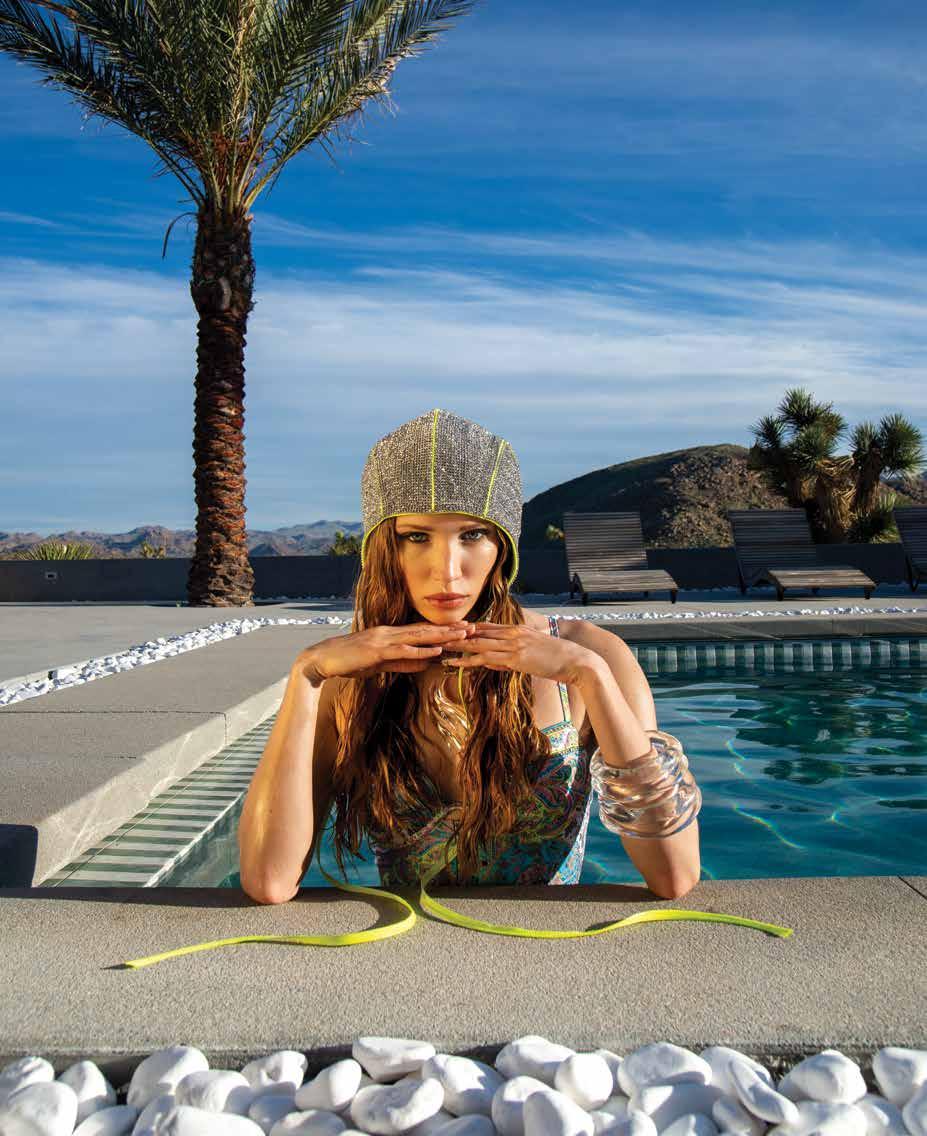 A few weeks ago, we found ourselves at Chris Collins’ Desert Dog House—a striking six-bedroom Joshua Tree oasis, complete with pickle ball court. For day one of our twoday shoot, Louis Vuitton shipped its Spring/ Summer ‘26 collection directly from New York to our remote California location. Model slash stylist slash photographer Joline Towers shot model Julia U of Bounty Models, this time styled by Ani, with Steinken on hair and Lynn Taylor on makeup (p78) . Lynn’s other hat is her accessory company called Penelope’s Parasols.