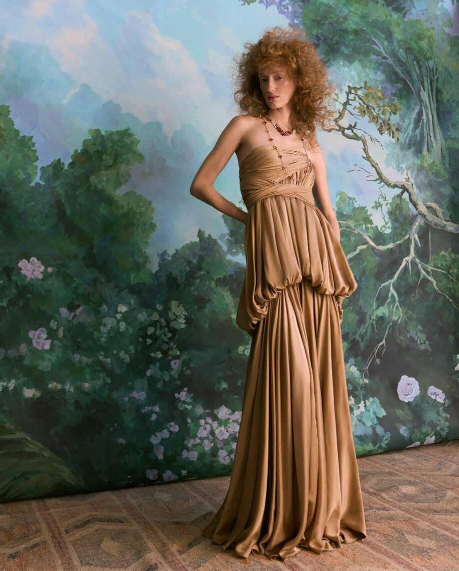 SAINT LAURENT BY ANTHONY VACCARELLO LONG RUFFLED GOWN, PUR, SAINT LAURENT 57TH STREET, 212-980-2970 OR YSL.COM