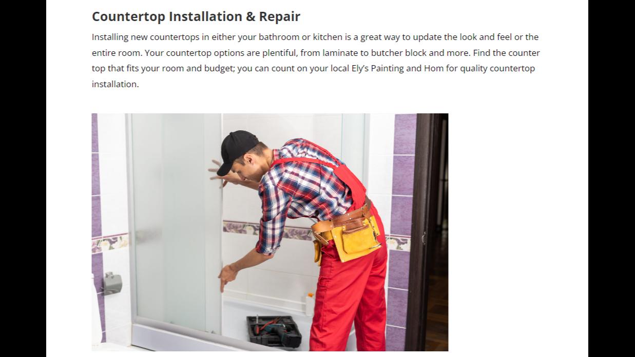Inadditiontoinstallations,Ely’sPaintingalsoofferscountertoprepairs.You canchoosefromavarietyofcountertopdesigns,includinglaminateor butcherblock.