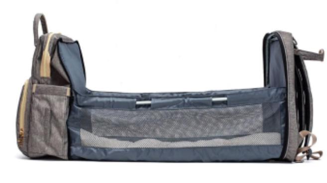 TheBabyCribBackpackhas acompartmentfordiapers andclothes,a3-bottle thermalstorage compartment,anditfoldsout tobecomeacrib!