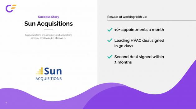 Theyhelpyouimprove yoursalespipelinewith targeted,high-volume prospectingservices thatdeliverM&A opportunitiessuitedto yourmandates.