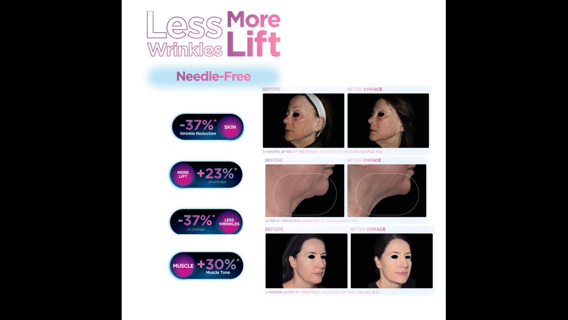 AfterahandfulofregularskinresurfacingEmface sessions,youshouldnoticemorevolumeinyourface, tighterskin,minimizedjowls,aliftedbrowandamore definedjawline.